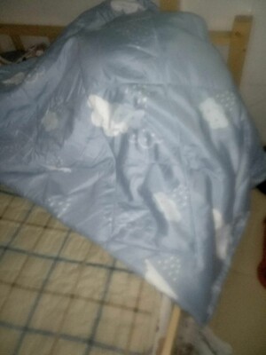 不好意思,评价晚了。被子已经晒过用上了。之前家里的被子大多是米色或是白色,大小不一,每次套被套都需要比划一番。这次的冰蓝色非常清新,辨识度高,不会拿错了。被子轻便实惠。字母被,一套等于三床被子用。非常满意!推荐大家购买使用哟!