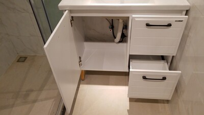 浴室柜挺好的,就是千叮咛万嘱咐要带下水最后还是没有带,最后自己买的,给我补了款,解决问题挺快的。特意买的纯白色跟我家浴室灰砖搭配,安装师傅也很负责任,帮我调好高低跟我确认水管位置,安装完打胶了所以还没有收拾,先拍一张。后期收拾好了追加