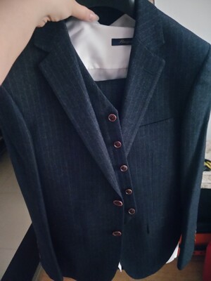 首先说西服,版型时尚,修身版,布料全羊毛,宝蓝色恰到好处,不张扬,适合各种场合。服务到位,有问必答,解决问题积极主动,赠品忘发了,马上安排补发,重点是还是发的顺丰,赞一个。推荐尺码合身。高170,重145,穿48码自我感觉合身,肩宽胸围腰围合适,特显身材。除了袖子和身长有点长,这完全是个人身材问题。总而言之非常满意,全5分好评,西服好评,服务好评,物流好评。之前评价从不发图,西服实在太好了,必须上图好评。