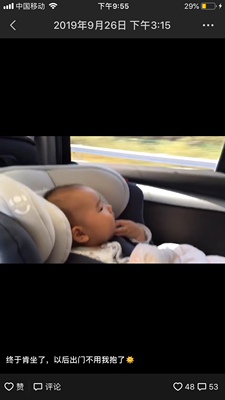 3、来自沈阳市的小李说:优点,外观可以,包裹可以,面料可以,有侧边撞击缓冲,有支撑腿,可以360旋转,价格可以接受。缺点,三档角度调节幅度不大,像我图片个拍的那样,最大角度还是靠不住靠背,只能靠支撑腿撑起来,中间会有空隙,孩子小转过来后,我把座椅已经固定到最紧,还是会有视频里的撞击声,颠簸路段也会有异响,老板让我拆开紧紧螺丝,声音会小点,新的咱也不敢拆啊,就没拆。总体来说,给好评了,因为外观喜欢,功能喜欢,价位能接受。紧供各位奶爸奶妈参考。