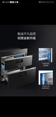 外观大气简单,110升的容量,内部空间很大,洗完碗放好只需一按,想消哪层消哪层,太好用了。黑晶玻璃面板,易清理,家庭必需品,跟细菌拜拜!赞,质量好,材质厚实,没有味道,按键反应灵敏,效果好,性价比超高,用起来非常方便,值得推荐
