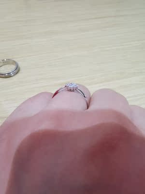 这个品牌这款戒指关注很久了,开始还担心买回来的实物没有图片好看,原来是我多虑了,戴上显得手很白。物流也给力昨天买的,今天上午就收到了,宝贝真的非常喜欢,戴中指很好看又特显钻,也很热情,给我推荐的尺寸刚好不大不小!晒个图给大家参考下,不过手机像素不是很好,实物比图片闪多了,下次有钱了再来买个更好的!
